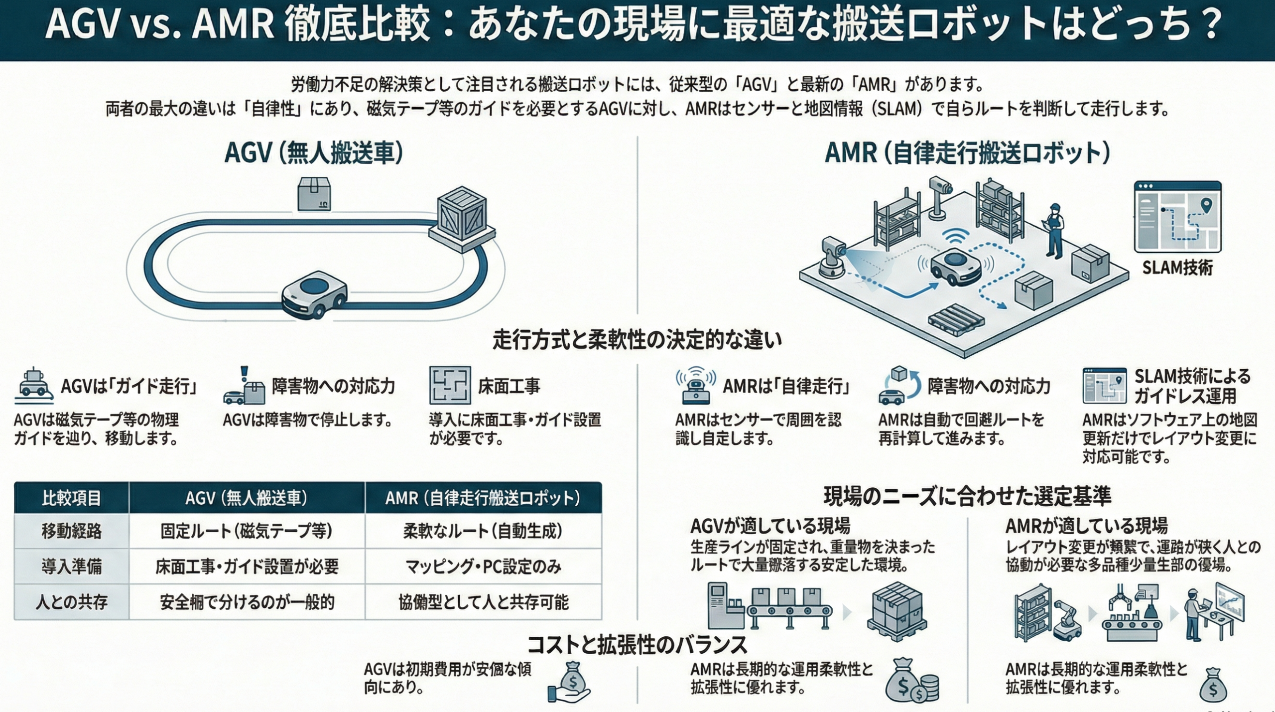 初期費用だけで見ればAGVの方が安価ですが、5年スパンのトータルコスト(TCO)で考えると、レイアウト変更が多い現場ではAMRの方が安くなるケースがあります。