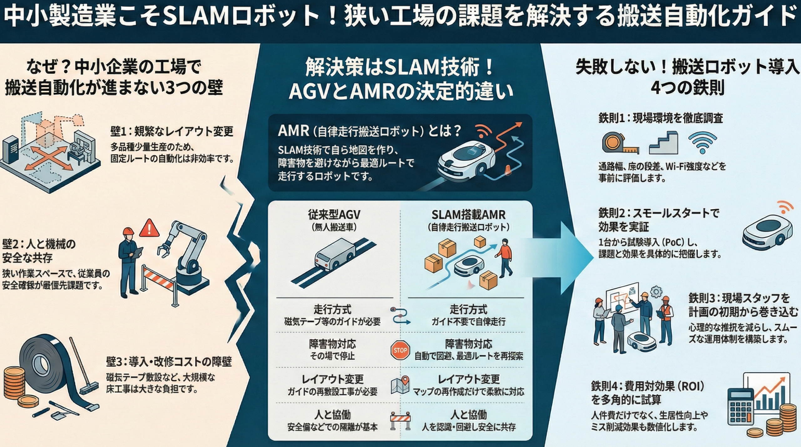 SLAM搬送ロボットは、単に物を運ぶだけの機械ではありません。導入プロセスを通じて工場のムダを見つけ、整理整頓を促し、社員の意識を変える「改革のパートナー」となり得る存在です。