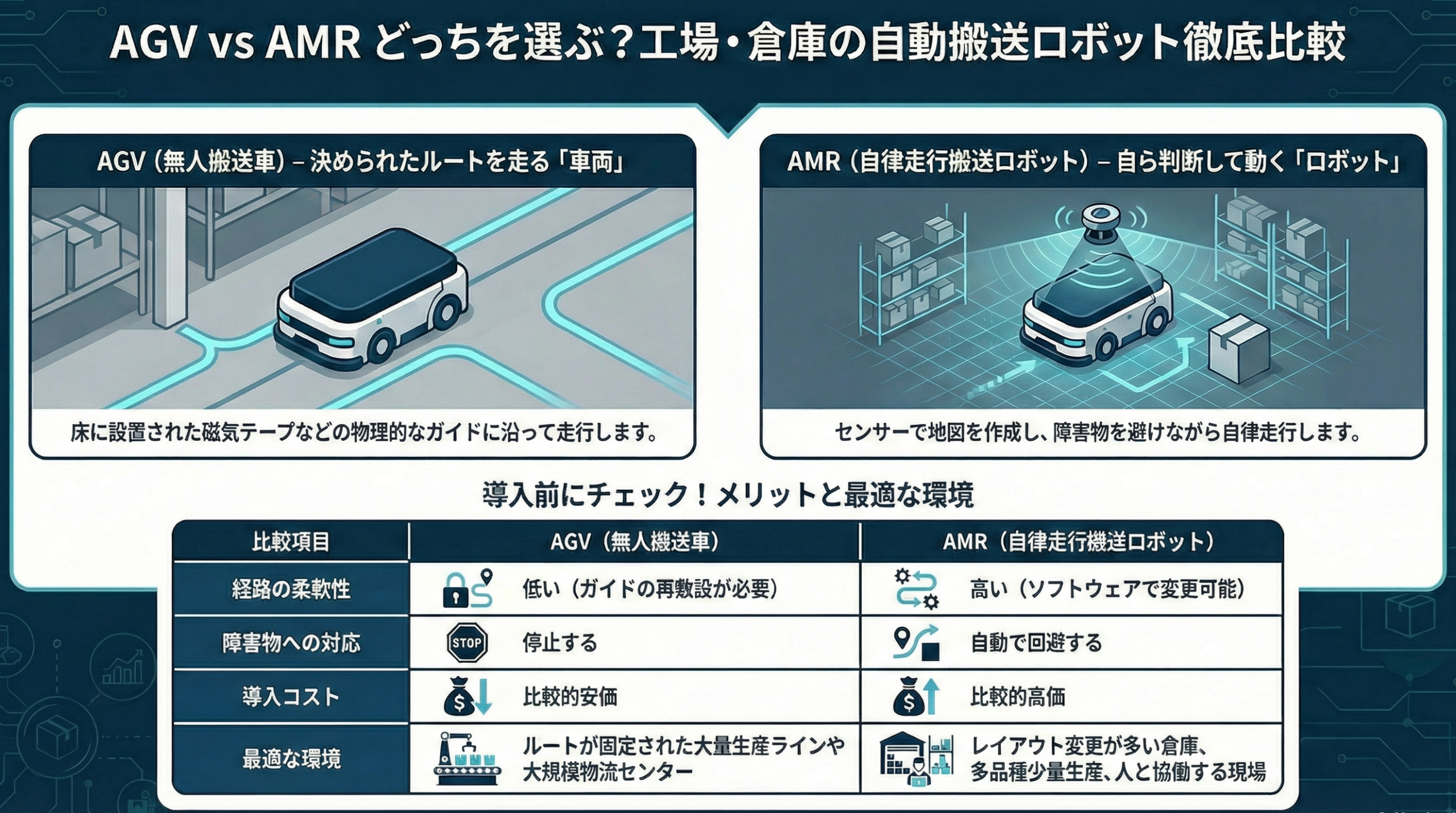 狭い工場で導入を検討する際、まず理解すべきは制御の仕組みです。結論から言えば、AGVは「電車の線路」、AMR(自律走行搬送ロボット)は「タクシー」のような動きをします。